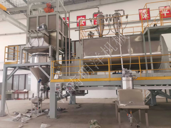噸包無塵投料站,真空上料機(jī)氣力輸送,臥式螺帶混合機(jī),真空上料機(jī)輸送,緩存?zhèn)},篩分除磁包裝生產(chǎn)線。