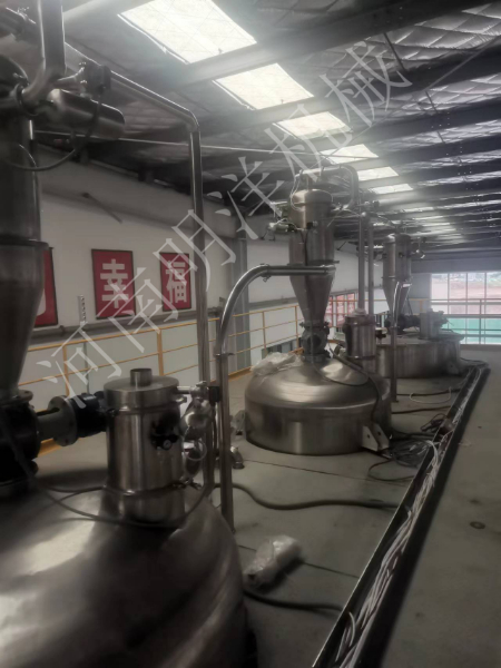 噸包無塵投料站,真空上料機(jī)氣力輸送,臥式螺帶混合機(jī),真空上料機(jī)輸送,緩存?zhèn)},篩分除磁包裝生產(chǎn)線。